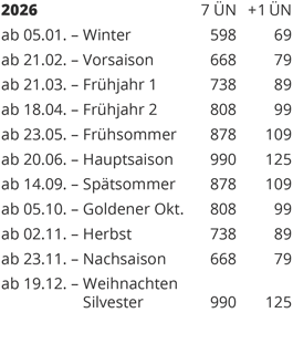 Saisonzeiten und Preise bei Belegung mit 2 Gästen
